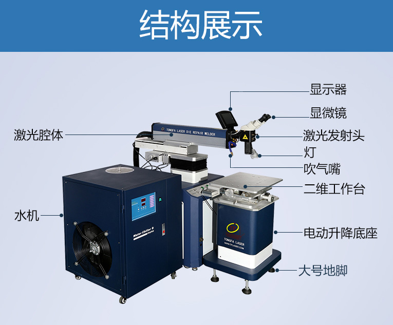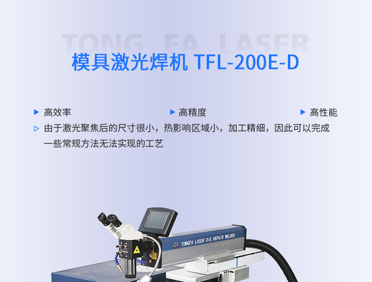 出口型模具激光焊機(jī)是通發(fā)激光公司專門為出口國(guó)外客戶使用而設(shè)計(jì)的系列機(jī)型TFL-200E-D,配置激光頭電動(dòng)升降,同時(shí)配置操縱桿無(wú)極調(diào)速控制XY橫向和縱向電動(dòng)移動(dòng)。適用于各類精密注塑模具、壓鑄模具等模具激光修補(bǔ)焊接;同時(shí)也適合鑄件沙孔激光修補(bǔ)、模具崩缺激光修復(fù)、過切加工等的激光修補(bǔ);各類金屬結(jié)構(gòu)件、金銀首飾的激光焊接加工。