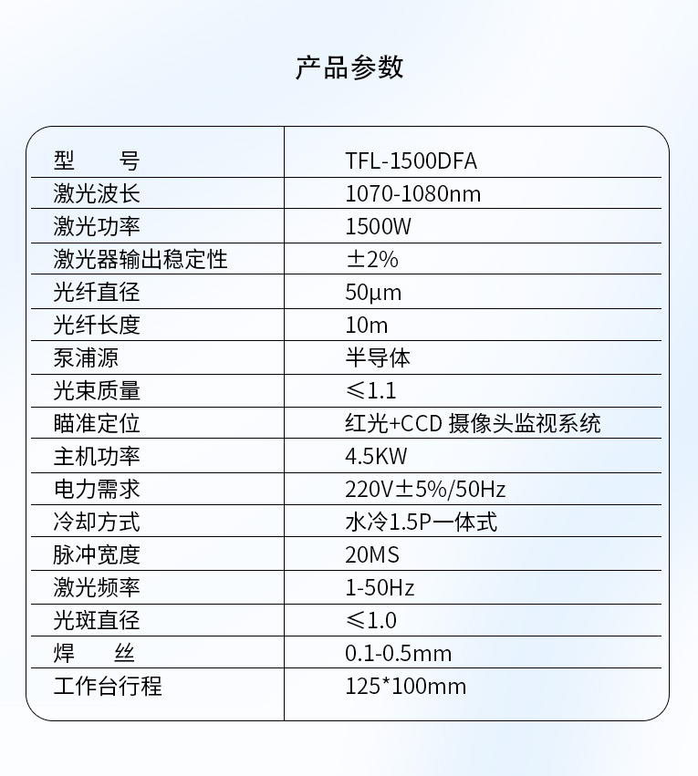 采用光纖激光器,反射率高,能量強,免維護,免調光,功耗少,相比傳統 模具焊來說,安全,穩定性好超長使用壽命。 1500W光纖激光器,滿足銅、鋁焊接量大的模具及產品焊接加工需要。 高承重底座及工作臺,保持輕便靈活的優點,同時提供更高承載能力。 配備.1.5P大功率一體式水冷水機,保證了大功率焊接的穩定性。